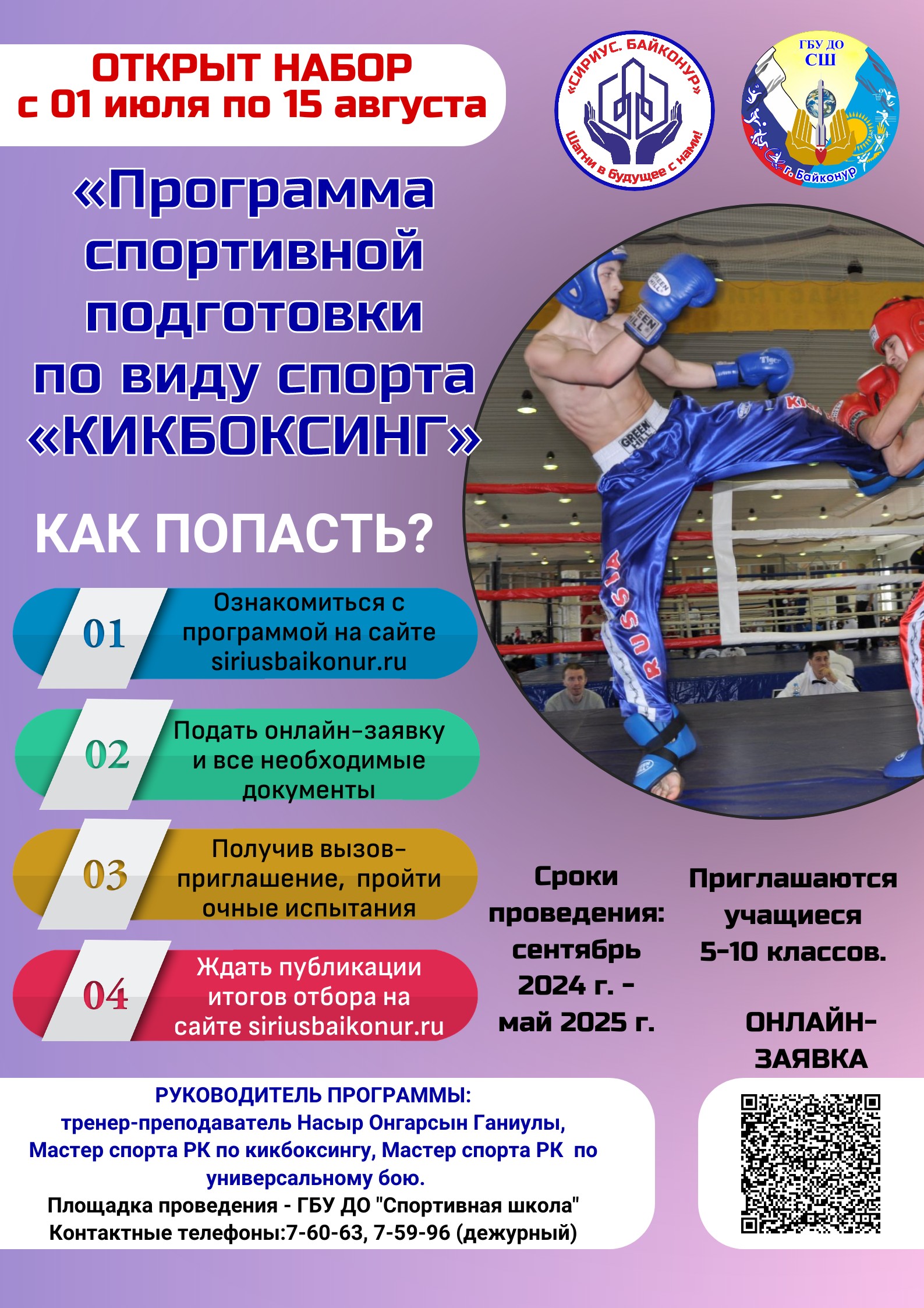 Руководитель программы: Насыр Онгарсын Ганиулы — тренер-преподаватель ГБУ ДО «СШ». Мастер спорта РК по кикбоксингу, Мастер спорта РК по универсальному бою.