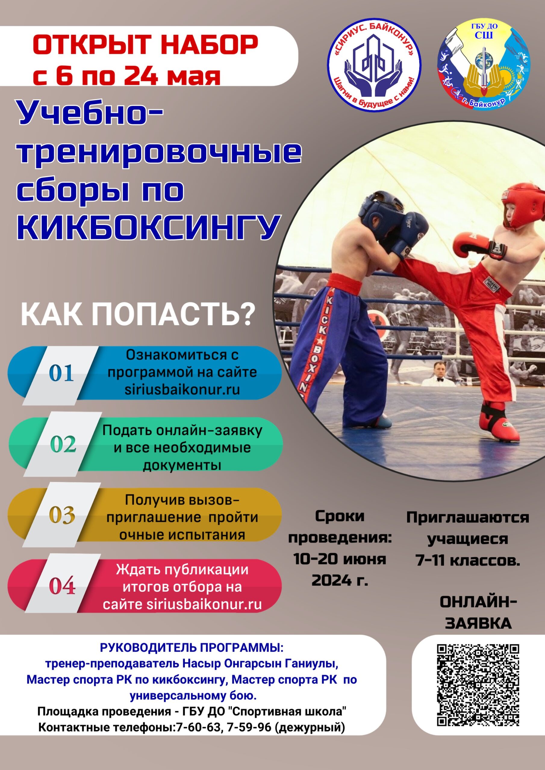 Критерии отбора: Для участия в Программе приглашаются обучающиеся 7–10 классов (по состоянию на 2023/2024 учебный год) общеобразовательных организаций г. Байконур демонстрирующие результаты по направлению «Кикбоксинг» и прошедшие отбор в соответствии с Положением о проведении учебно-тренировочных сборов.