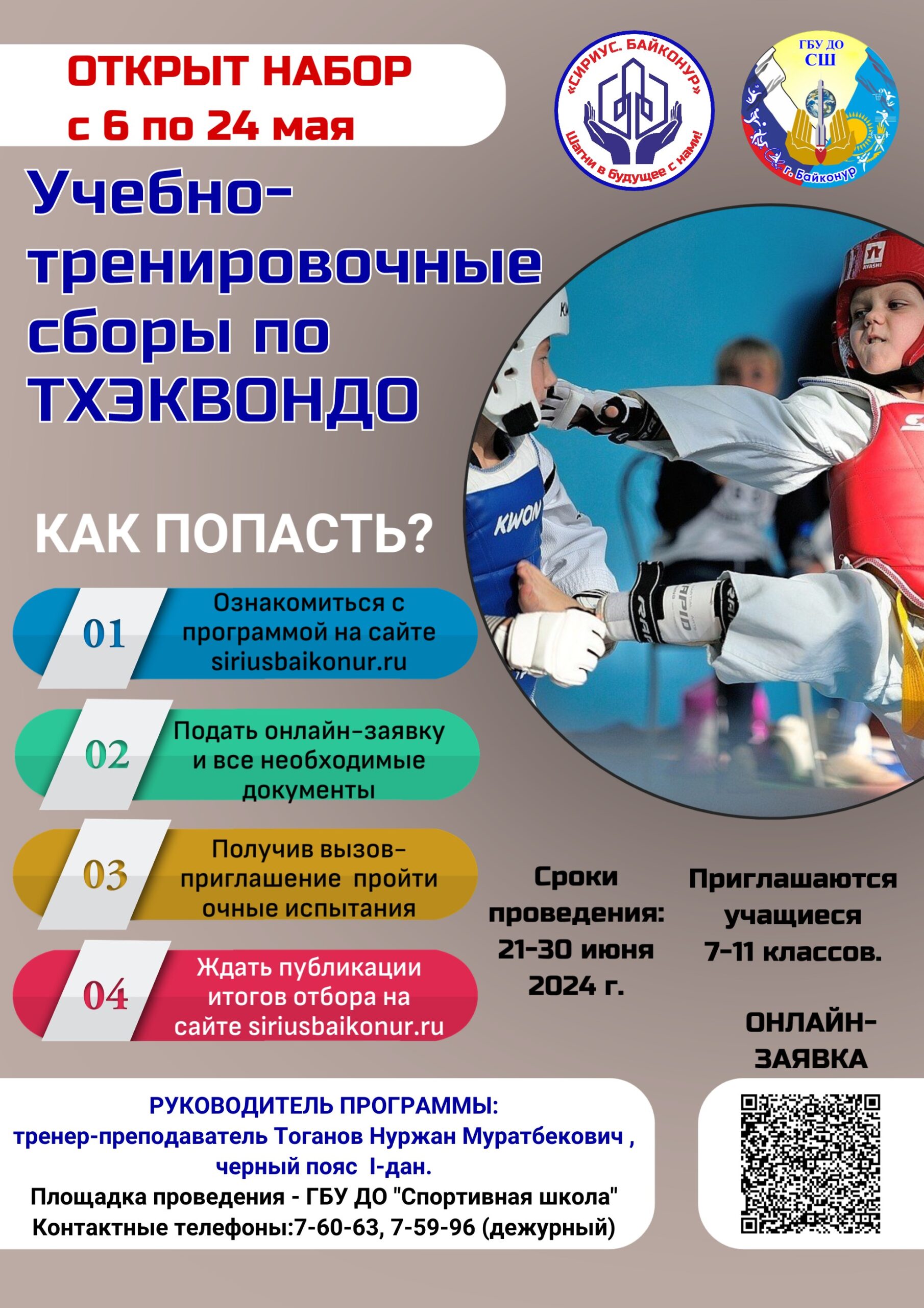 Критерии отбора: Для участия в Программе приглашаются обучающиеся 7–10 классов (по состоянию на 2023/2024 учебный год) общеобразовательных организаций г. Байконур демонстрирующие результаты по направлению «Тхэквондо» и прошедшие отбор в соответствии с Положением о проведении учебно-тренировочных сборов.