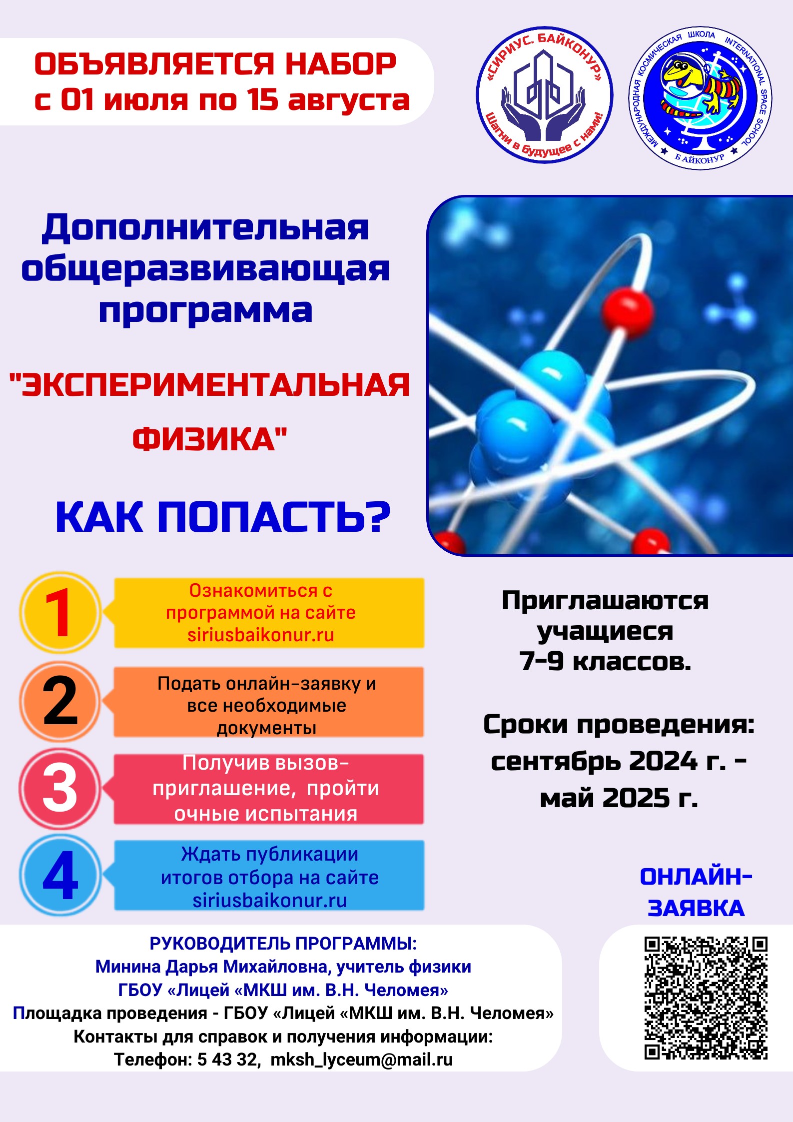 Руководитель программы: Минина Дарья Михайловна, учитель физики ГБОУ «Лицей «МКШ им. В.Н. Челомея»
